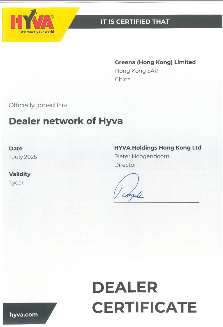 As Hyva’s trusted authorized dealer, Greena combines global technology with local expertise to provide reliable, high-performance waste solutions tailored to Hong Kong’s needs.